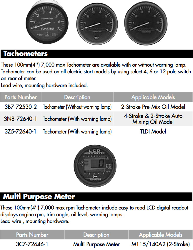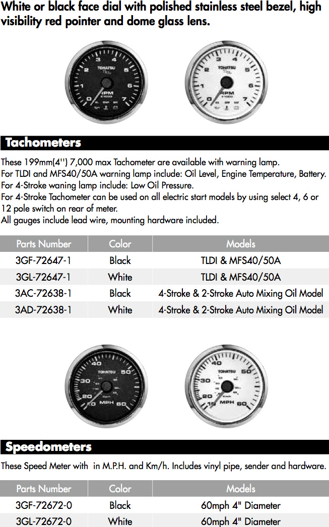 A variety of Tohatsu gauges are available; Hour Meters, Speedometers, Tilt/Trim Gauges, Analog and LCD Tachometers all available in standard style and 'premium' with chrome bezel and colour options. Also available are TOCS gauges 'Tohatsu Onboard Communications System'.